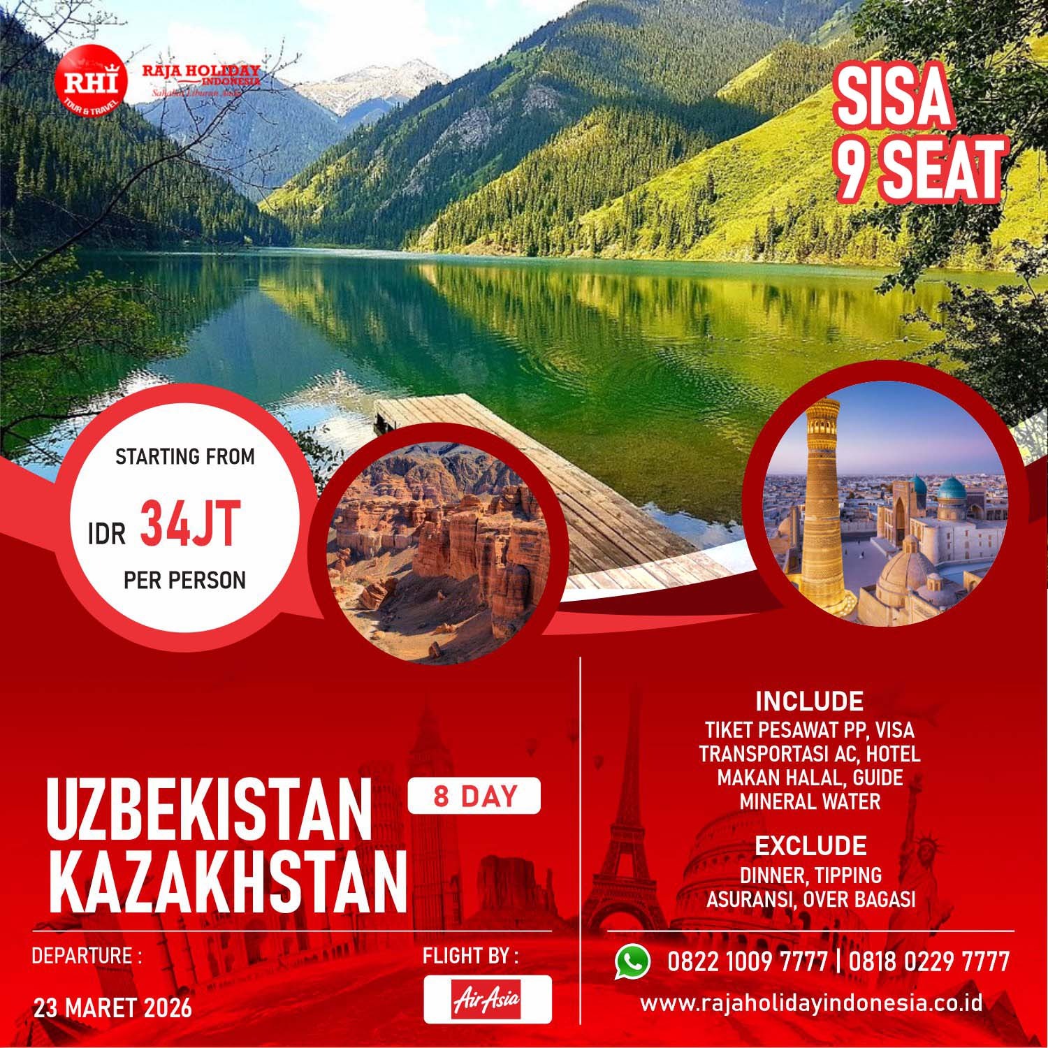 Hightlight : Tashkent City, Bukhara Old City, Masjid Bolo Hauz, Ark Citadel, Poi Kalon Complex, Domes Bukhara, Gijduvan Pottery, Makam Imam Al-Bukhari, Registan Square, Shakhi Zindeh Complex, Gur Emir Mausoleum, Siyob Bazaar, Medeo Gorge, Shymbulak Ski Resort, Tian Shan Mountains, Charyn Canyon, Kolsay Lake, Green Bazaar, Panfilov Park, Central Mosque Almaty, Kok Tobe Hill