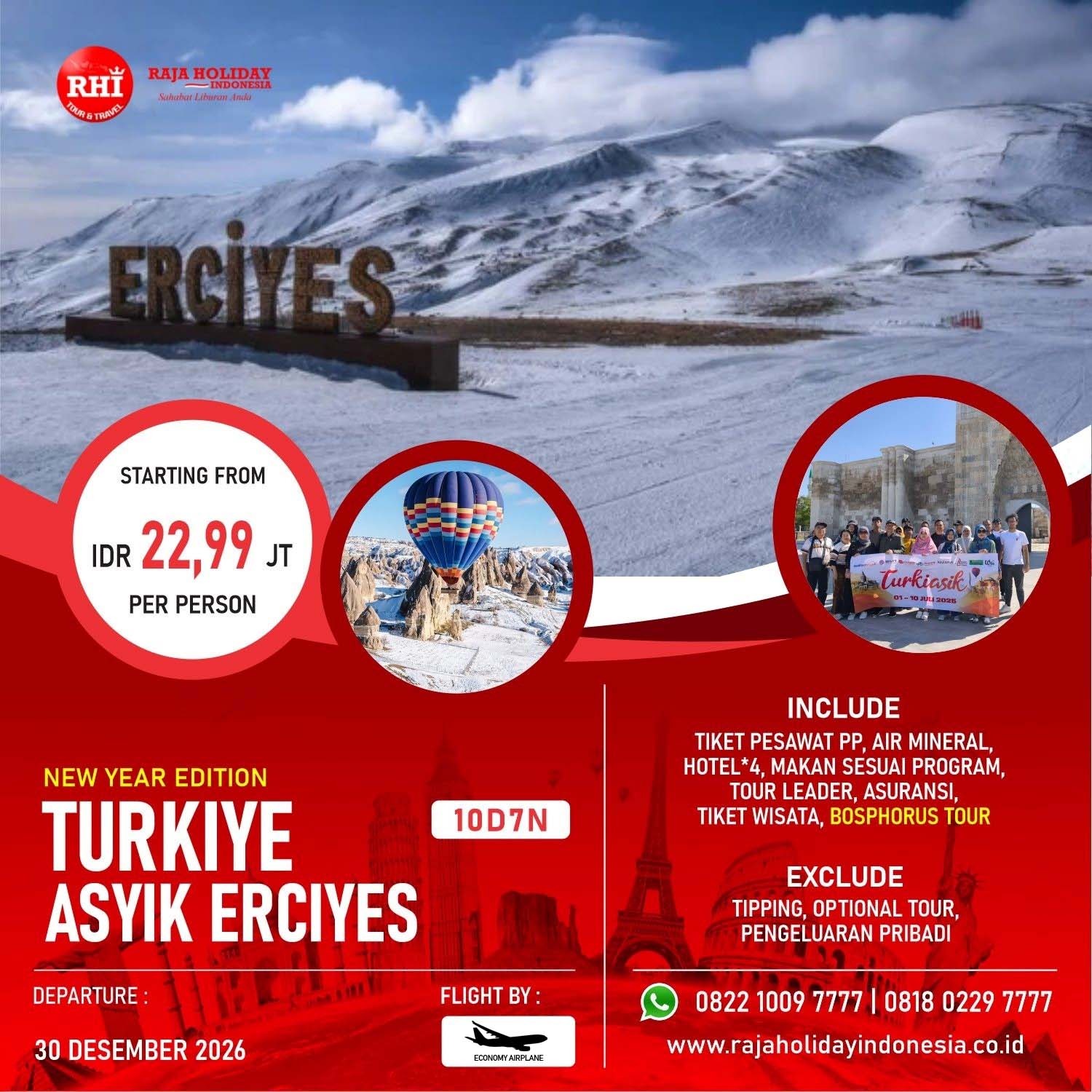Hightlight : Topkapi Palace, Hagia Sophia, Blue Mosque, Hippodrome, Grand Mosque Bursa, Tophane Hill, Turkish Delight Shop, Ephesus Ancient City, Hierapolis, Cotton Castle Pamukkale, Textile Outlet, Sultanhani Caravanserai, Cappadocia Underground City, Avanos Pottery Village, Pigeon Valley, Devrent Valley, Goreme Valley, Uchisar Castle, Turkish Carpet Factory, Erciyes Mountain