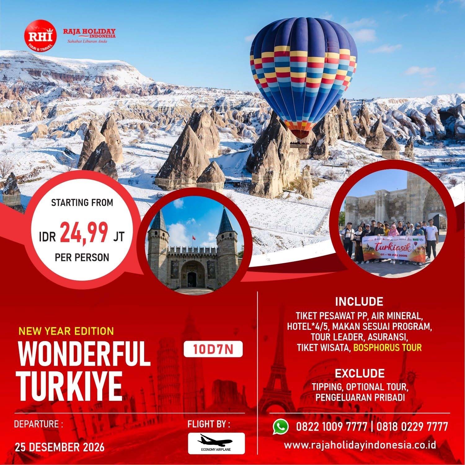 Hightlight : Grand Mosque Bursa, Turkish Delight Shop, Turkish Leather Outlet, Kota Tua Ephesus, Hierapolis, Cotton Castle Pamukkale, Textile Outlet, Konya, Sultanhani Caravanserai, Cappadocia Underground City, Avanos Pottery Village, Pigeon Valley, Devrent Valley, Goreme Valley, Uchisar Castle, Turkish Carpet Factory Outlet, Erciyes Mountain, Topkapi Palace, Hagia Sophia, Bosphorus Cruise