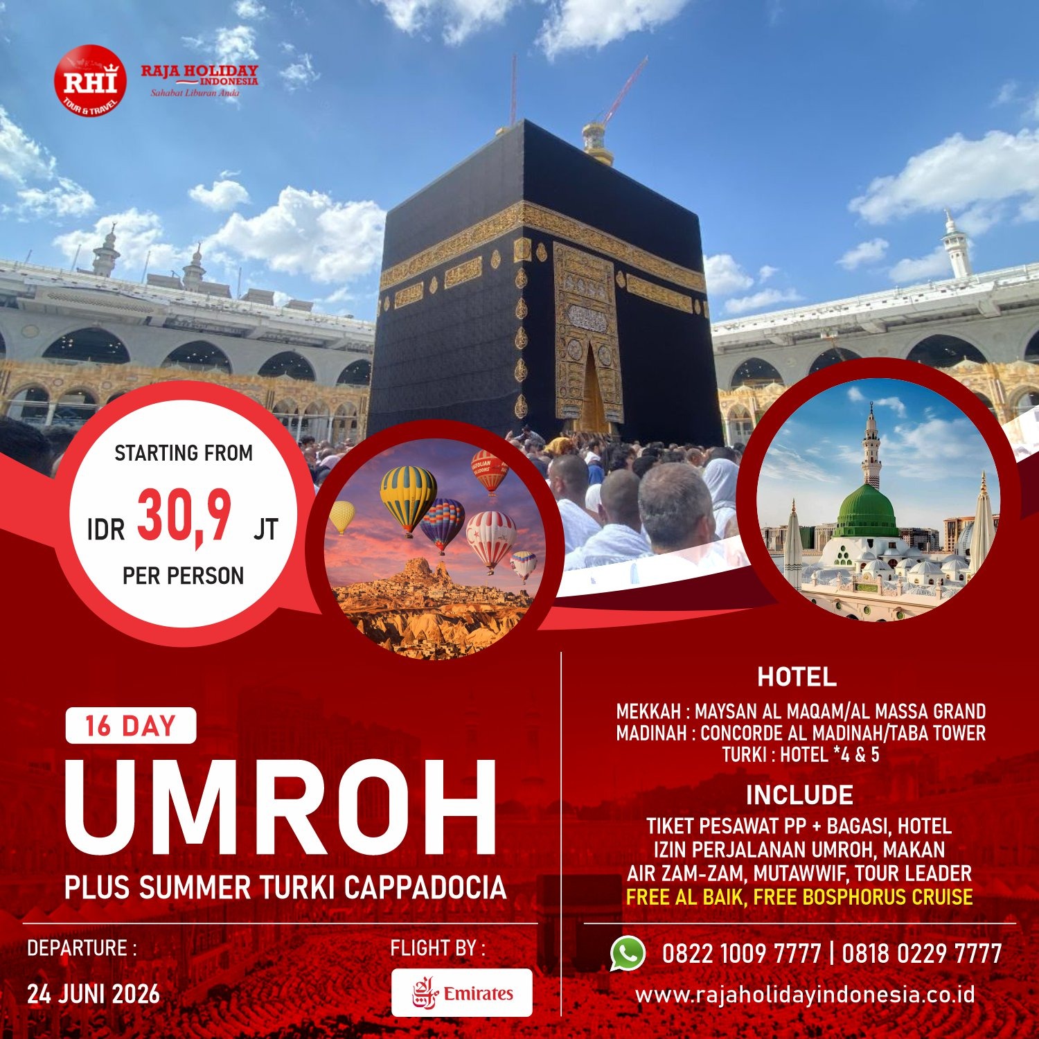 Hightlight : Masjid Nabawi, Masjid Quba, Jabal Uhud, Masjid Qiblatain, Pemakaman Baqi, Raudhah, Masjidil Haram, Jabal Tsur, Jabal Rahmah, Arafah, Mina, Jamarot, Istanbul City Tour, Bursa Grand Mosque, Tophane Hill, Kusadasi, Sirince Village, Pamukkale Cotton Castle, Konya Caravanserai, Cappadocia Hot Air Balloon, Göreme Valley, Pigeon Valley, Uchisar Castle, Museum Ataturk Ankara, Hagia Sophia, Masjid Biru, Bosphorus Cruise, Spice Bazaar