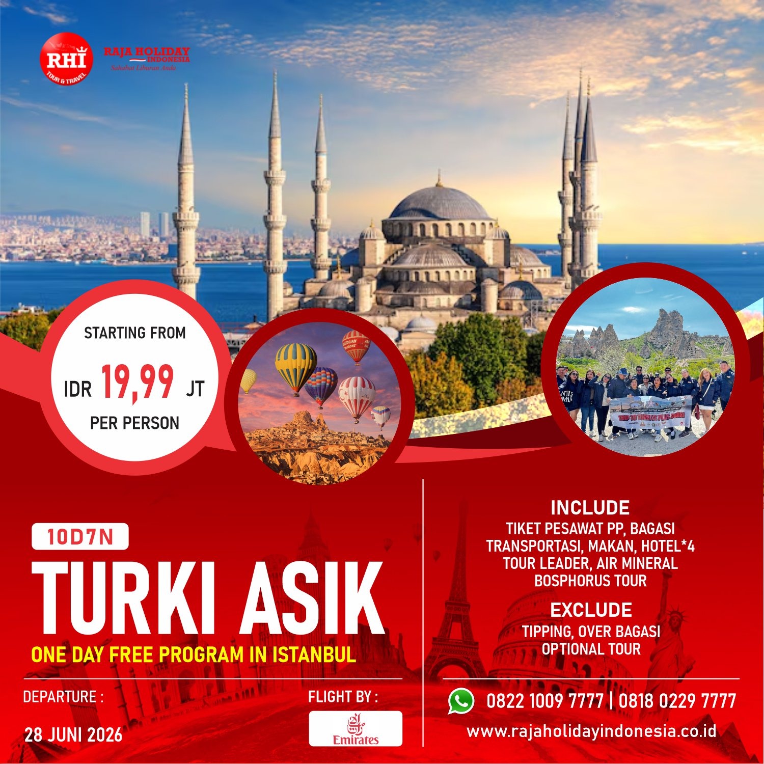 Raja Holiday Indonesia, Penyedia Jasa Tour Domestik Indonesia, Luar Negeri, Asia, Eropa & Timur Tengah. Menyediakan menyediakan Paket Tour Murah, Paket Wisata Murah, Liburan Keluarga dan Bulan Madu ke Turki, Dubai, Rusia, Malaysia, Singapore, Thailand, Vietnam, Kamboja, Korea, Jepang dan China.