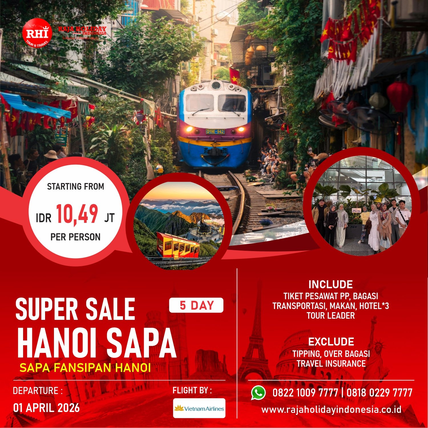 Hightlight : Premium flight Vietnam Airlines, Meals on flight, Cat Cat Village, Hydro Electric Power Station, Suku Hmong traditional village, Sapa City Tour, Fansipan Cable Car, Hoang Lien Son Mountain, Pagoda spiritual site, Funicular ride to Fansipan peak, St. Joseph Cathedral, Ho Chi Minh House, Ho Chi Minh Mausoleum, Ba Dinh Square, One Pillar Pagoda, Tran Quoc Pagoda (West Lake), Street Train Hanoi, Free coffee experience, Shopping oleh-oleh Hanoi
